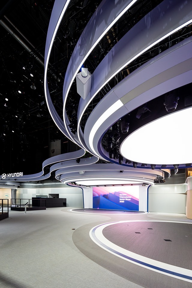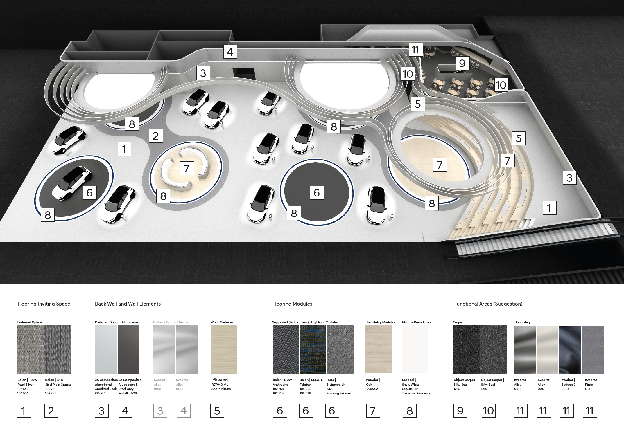 The premiere of the new trade show concept was to take place at the Motor Show in Geneva 2020. Unfortunately, due to the Corona pandemic, this had to be cancelled shortly before the completion of the booth. Nevertheless, it was a great success for us, as we were able to check the execution in the chosen materials, such as the curved facade in Alu Dibond, the floor in Bolon, or the metallic fabric covering of the highlight modules and the roof. In addition, we had the opportunity to test ourselves the application of the new guideline, which from then on was implemented worldwide.